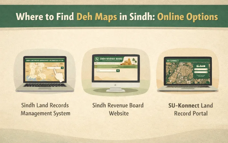 Deh maps in Sindh can be searched through the LARMIS portal managed by the Board of Revenue Sindh at sindhbor.gos.pk. You need to select your district, taluka, and Deh, then enter the survey number. Where digitization is complete, boundary data and scanned map images are available. For areas not yet digitized, the physical Shajra must be obtained from the local Patwari’s office.